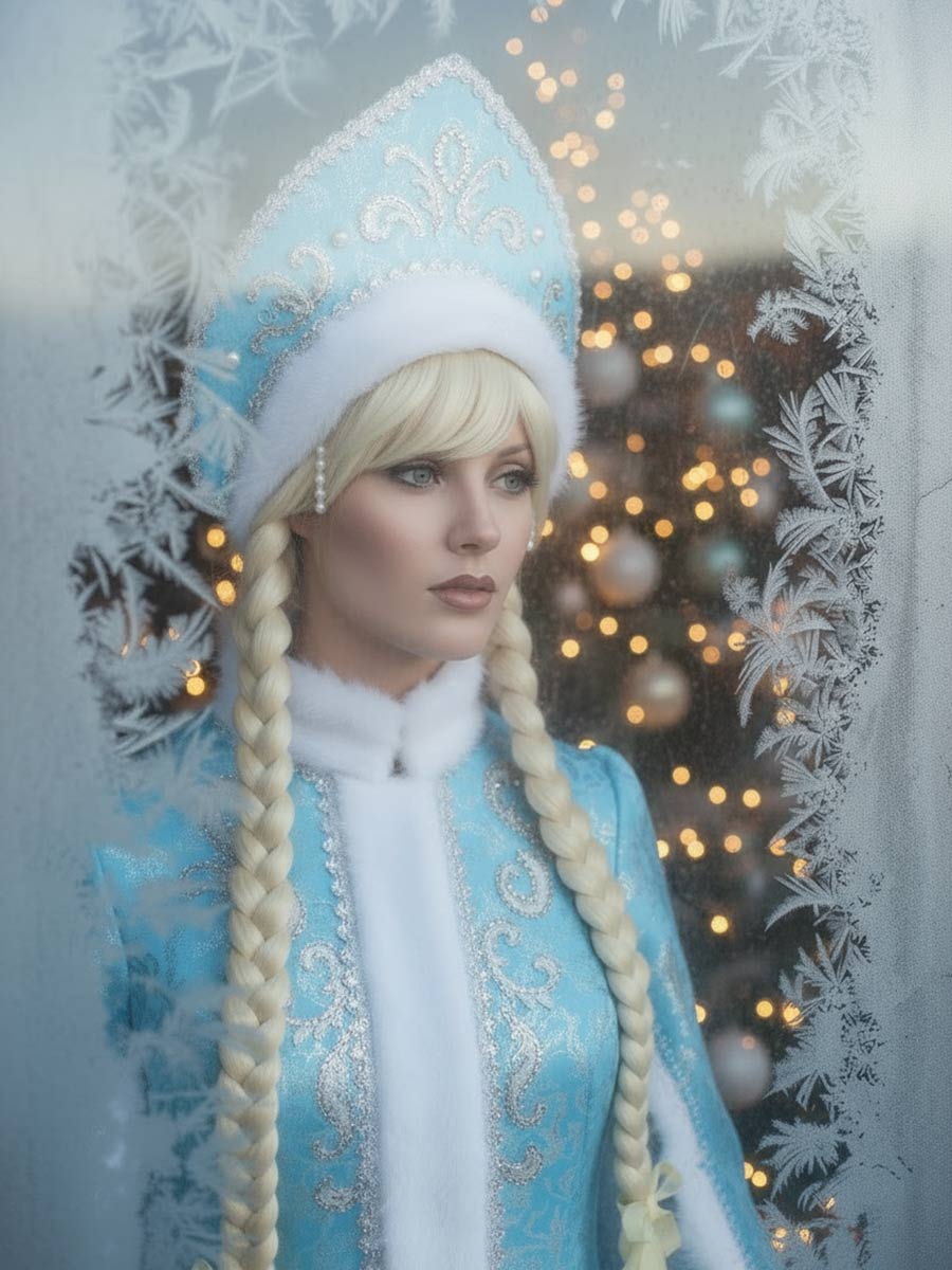 Парик Снегурочки изготовлен из искусственных волос (улучшенного канекалона). Длина кос 75 см, у модели есть челка и прямой пробор. При необходимости вместо двух кос можно заплести одну. Шапочка изготовлена на основе эластичной тресс-ленты, легко надевается и снимается. Парик хорошо держит форму под снегом или дождем во время уличных праздников. Он согревает, избавляя Снегурочку от необходимости надевать головной убор.